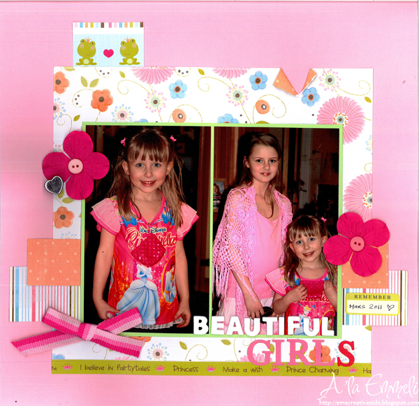 Jag har gjort ytterligare en rosa, sagolayout med de underbara papperen från Imaginisce Enchanted. Mönstrade papper, band, blommor och knappar kommer från